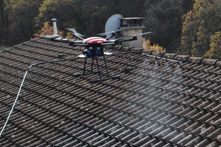 Nos drones sont équipés de systèmes de pulvérisation pour nettoyer les vitres des bâtiments de plusieurs étages ainsi que des façades pour éliminer la saleté, la pollution, les algues ou la mousse.